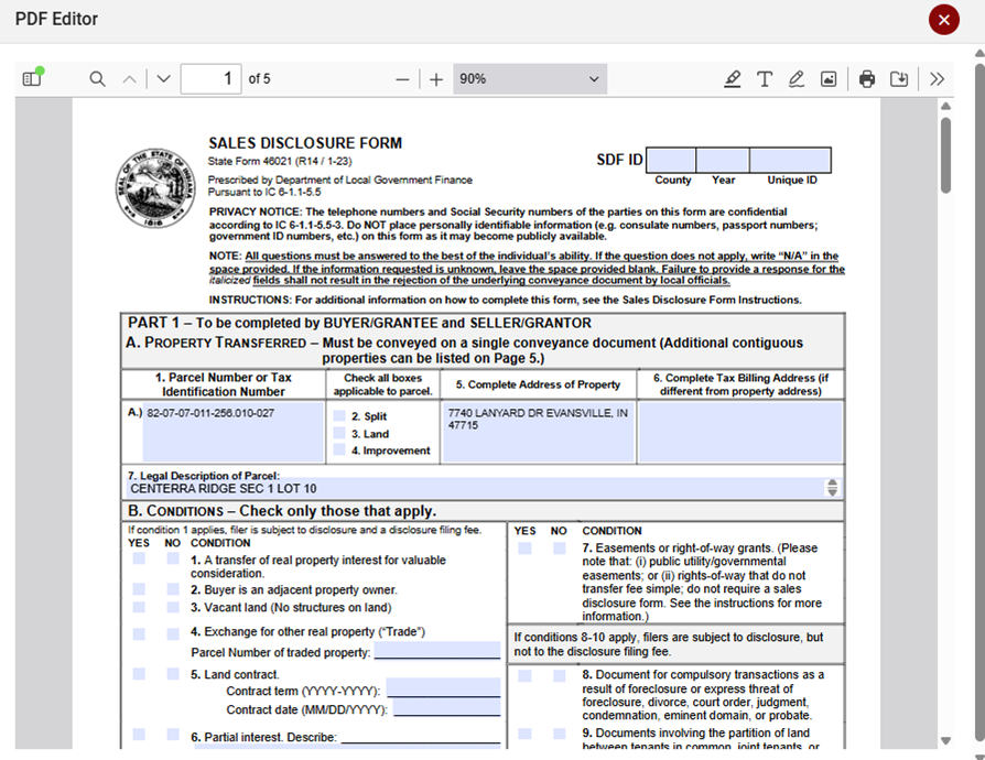 The Sales Disclosure module provides users online access to an interactive Sales Disclosure form, which is auto-populated with known property tax information from XSoft CAMA™ to simplify and reduce the information needed from the user. Once user information is entered, the completed Sales Disclosure form can be downloaded, printed, and then submitted to the county for review and approval.